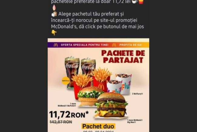Directoratul Național de Securitate Cibernetică avertizează asupra unei tentative de fraudă prin folosirea imaginii McDonald’s România.